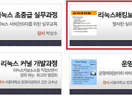 서버운영 (TA, ADMIN)/정보보안 (26) 리스트형 [정보보안] 리눅스포털 리눅스 해킹/보안 완강 강좌명 : 리눅스 해킹보안관리 과정(완강) 강사명 : 홍석범 고려대학교 재학시절 학과서버를 구축, 운영한 것이 계기가 되어 리눅스에 관심을 갖게 되었고 졸업이후 (주)오늘과내일에 입사하여 서버, 네트워크 관리 및 보안을 담당하고 있다. 여러 세미나와 기관에서, 실무 경험을 바탕으로 시스템 및 네트워크 보안에 대해 쉽게 강의하는것으로 인기가 있으며 보안 메일링리스트인 sec-info@certcc.or.kr의 답변 전문가로 알려져 있다. 수강 기간 : 2016년 8월 10일 ~ 2016일 10월 4일 [제1강좌] 네트워크의 큰 그림을 그려보자 1-1 강좌 : 강좌를시작하며(08:08) 2-1 강좌 : 인터넷의 작동방식/ARP 작동방식(38:40) 3-1 강좌 : ARP(Adress Resolution Pro.. 이전 1 ··· 3 4 5 6 다음
