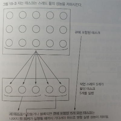 k 스레드를 가진 스레드 풀은 오직 k만큼의 스레드를 동시에 실행할 수 있다. 초과로 제출된 태스크는 큐에 저장되며 이전에 태스크 중 하나가 종료되기 전까지는 스레드에 할당하지 않는다. 불필요하게 많은 스레드를 만드는 일을 피할 수 있으므로 보통 이 상황은 아무 문제가 되지 않지만 잠을 자거나 I/O를 기다리거나 네트워크 연결을 기다리는 태스크가 있다면 주의해야 한다. I/O를 기다리는 블록 상황에서 이들 태스크가 워커 스레드에 할당된 상태를 유지하지만 아무 작업도 하지 않게 된다. 그러면 나머지 15개의 태스크를 두 스레드가 실행해야 하므로 작업 효율성이 예상보다 절반 가까이 떨어지게 된다. 처음 제출한 태스크가 기존 실행 중인 태스크가 나중의 태스크 제출을 기다리는 상황(Future의 일반적인 패턴)이라면 데드락에 걸릴 수도 있다. 핵심은 블록(자거나 이벤트를 기다리는)할 수 있는 태스크는 스레드 풀에 제출하지 말아야 한다는 것이지만 항상 이를 지킬 수 있는 것은 아니다.