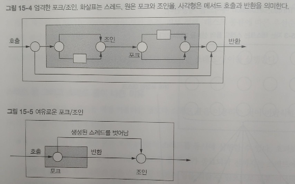 병렬 스트림 처리와 포크/조인 프레임워크에서의 동시성과 현재의 동시성이 어떻게 다른지 명확히 알아보도록 전자 동시성에서는 한 개의 특별한 속성 즉, 태스크나 스레드가 메서드 호출 안에서 시작되면 그 메서드 호출은 반환하지 않고 작업이 끝나기를 기다렸다. 다시 말해 스레드 생성과 join()이 한 쌍처럼 중첩된 메서드 호출 내에 추가 되어 있다. 이를 엄격한 포크/조인 이라고 부른다.