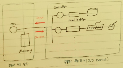 사용자가 I/O 요청을 할때 CPU가 I/O Controller에 요청을 하고 I/O Controller가 파일을 다 가져오면 그것을 Memory에 적재시키고 CPU에게 완료되었다고 알려준다. 즉 큰 그림은 CPU -> I/O Controller -> CPU의 형태이다.