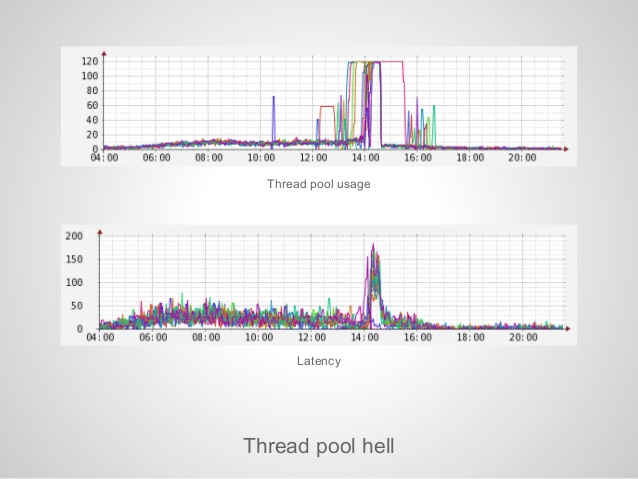 다음은 Linkedin의 Thread pool hell 현상에 대한 그래프이다. Thread pool이 감당할 수 있는 요청수를 넘는 순간부터는 평소보다 수배나 많은 지연시간을 보여준다.