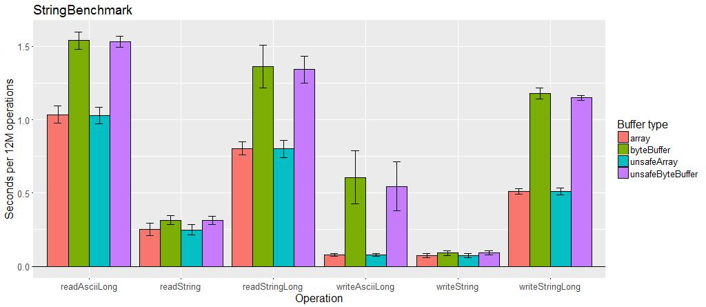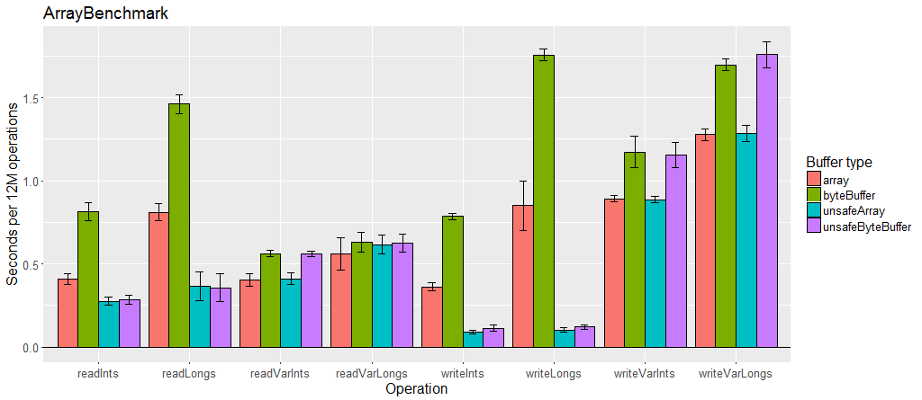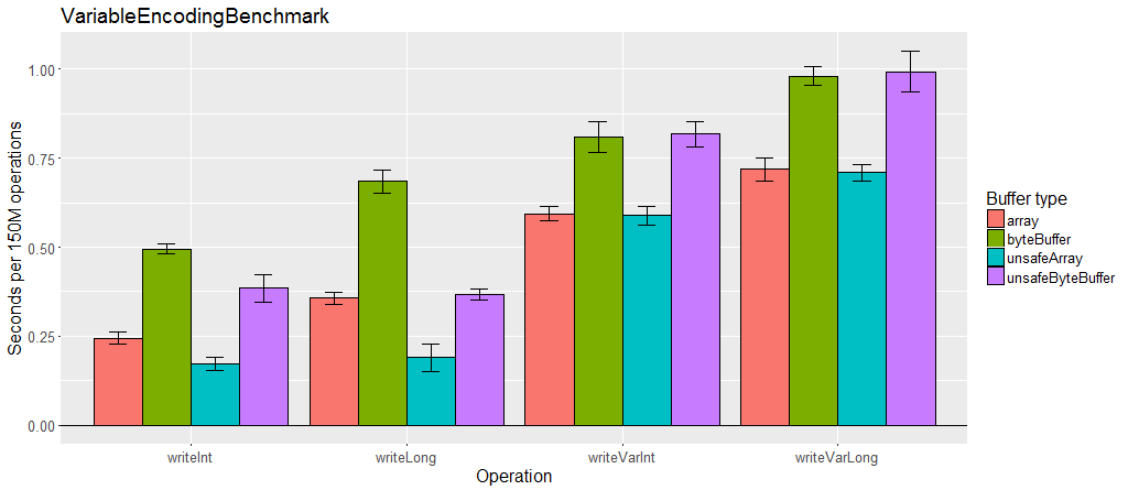 unsafe buffer의 가장 큰 성능 차이는 가변 길이 인코딩을 적용하지 않은 사이즈가 큰 primitive array에서 드러난다. unsafe buffer나 특정 필드(FieldSerializer 사용시)에만 가변길이 인코딩을 비활성화 할 수도 있다.