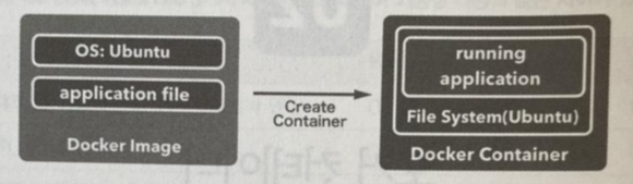 도커 이미지 하나로 여러 개의 컨테이너를 생성할 수 있다. 위 그림에서 도커 이미지는 우분투 파일 시스템을 실행하는 애플리케이션 파일을 담고 있다. 컨테이너가 생성될 때 이미지로부터 이를 구체화하고 컨테이너 안의 우분투 파일 시스템상에서 애플리케이션이 실행된다. 컨테이너로 애플리케이션을 실행하려면 컨테이너 형태로 구체화될 템플릿 역할을 하는 이미지를 먼저 만들어야 한다.