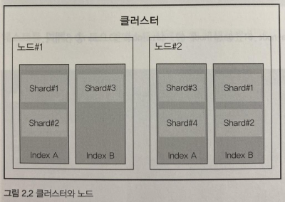 클러스터는 물리적인 노드 인스턴스들의 모임이다. 클러스터는 모든 노드의 검색과 색인 작업을 관장하는 논리적인 개념이라 할 수 있다. 관계형 데이터베이스의 경우 모든 요청을 서버 하나에서 처리해서 결과를 제공하지만 엘라스틱서치의 경우에는 다수의 서버로 분산해서 처리하는 것이 가능하기 때문에 대용량 데이터를 처리할 수 있다.