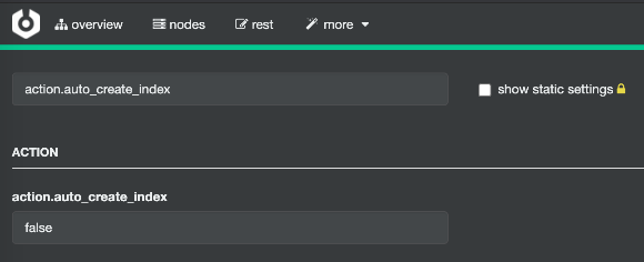 노드 설정 파일에서 action.auto_create_index를 false로 설정할 경우 자동으로 인덱스가 생성되지 않는다. 또는 인덱스별로 제공되는 index.maapper.dynamic 설정을 false로 설정하면 특정 칼럼의 자동 매핑 생성을 비활성화할 수 있다.