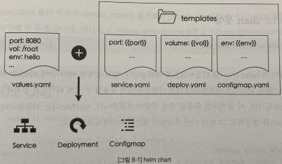패키지가 설치될 시점에 values.yaml 파일의 설정값들을 이용하여 templates 디렉토리에 들어있는 YAML 파일의 구멍난 부분을 채운다. values.yaml 파일에는 자주 바뀌거나 사용자마다 달라지는 설정값들을 입력하는 용도로 사용하고 templates 디렉토리는 패키지의 뼈대를 이룬다.