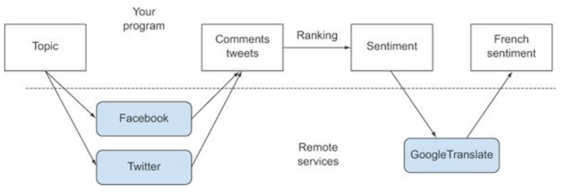이런 애플리케이션을 구현하려면 인터넷으로 여러 웹서비스에 접근해야 한다. 하지만 이들 서비스의 응답을 기다리는 동안 연산이 블록되거나 귀중한 CPU 클록 사이클 자원을 낭비하고 싶진 않다. 예를 들어 페이스북의 데이터를 기다리는 동안 트위터 데이터를 처리하지 말란 법은 없다.