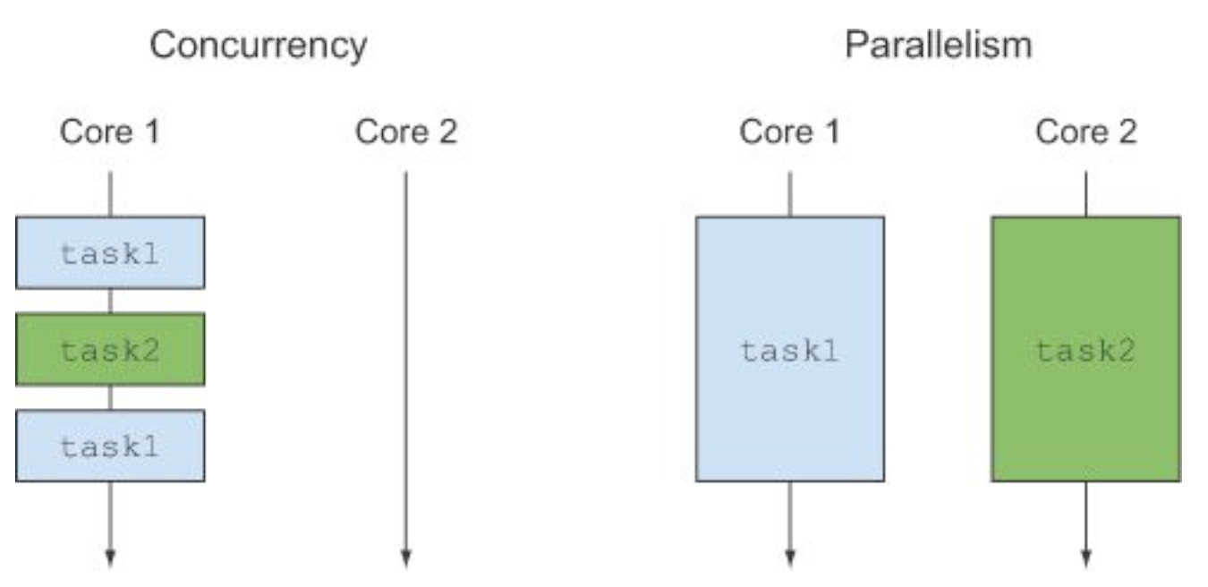 다음 그림은 동시성/병렬성의 차이를 보여준다. 동시성은 단일 코어 머신에서 발생할 수 있는 프로그래밍 속성으로 실행이 서로 겹칠 수 있는 반면 병렬성은 병렬 실행을 하드웨어 수준에서 지원한다.