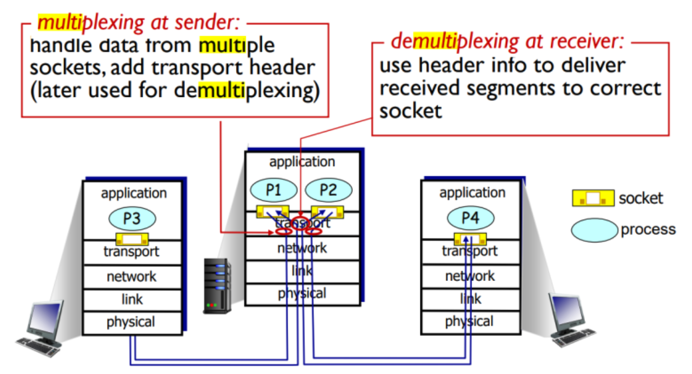 Transport Layer의 주된 기능 중 하나가 Multiplexing과 Demultiplexing입니다. Transport Layer는 end-point에 존재하는 host 끼리의 안전한 송수신을 보장하기 위해서 존재하는 계층입니다. Trnsport Layer에서는 특정 port 번호를 가진 TCP/UDP 패킷들을 port 번호대로 분류한 다음, port와 연결된 소켓으로 해당 데이터를 전달해 주는 역할을 합니다. Trnsport Layer의 segment 헤더 정보를 읽고, 해당 port 번호와 연결되어 있는 소켓을 찾아서 데이터그램을 분배해 주는 역할을 합니다. 이렇게 하나의 Transport Layer가 여러 소켓에게 데이터를 분배해주는 1->N으로 흘러가는 동작 과정을 Demultiplexing이라고 합니다. 반대로 데이터를 보낼때는 여러, 소켓들이 하나의 Transport Layer로 요청을 보내게 되는데, 요청한 소켓에 Trnasport Layer의 packet 헤더를 붙여서 network layer라는 하나의 인터페이스로 전달하는 N->1의 과정을 Multiplexing이라고 합니다. (소켓은 Application Layer와 Transport Layer를 연결해주는 통로와 같은 개념)