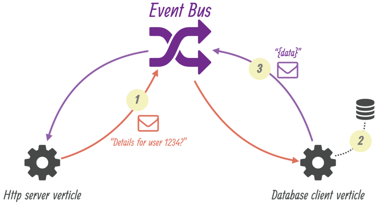 Verticle은 Vert.x에서 코드의 기술적 배포 단위이다. Vert.x 이벤트 버스는 다양한 verticle이 비동기 메시지 전달을 통해 통신할 수 있는 주요 도구이다. 예를 들어 HTTP 요청을 처리하는 verticle과 데이터베이스에 접근하는 verticle이 있다고 가정해보자. 이벤트 버스는 HTTP verticle이 데이터베이스 verticle에 SQL 쿼리를 수행하도록 요청을 보내고, 데이터베이스 verticle이 HTTP verticle에 응답할 수 있도록 한다: